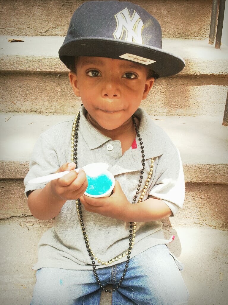 This monster was so not amused by all the stunts his big brother CJ attempted while he got jolted around uncontrollably from side to side. To cheer him up he suckered his daddy into standing on line for some yummy frozen treats from Imperial Woodpecker Sno Balls.